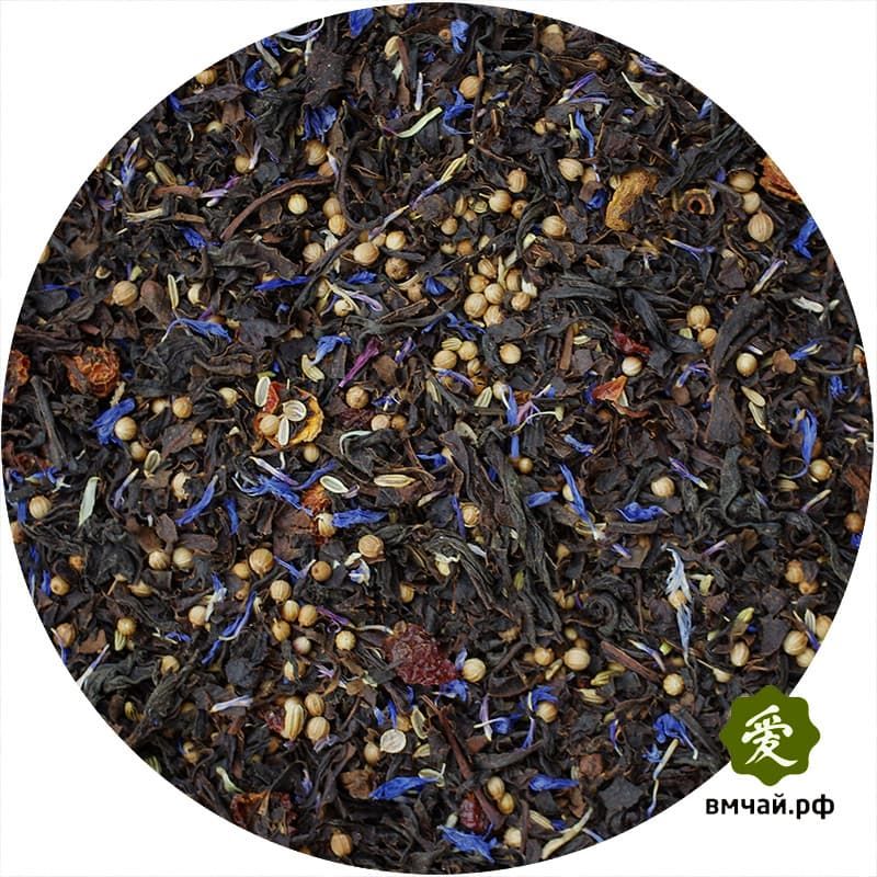 Черный чая из Индии, цельная гвоздика, кожура шиповника, кориандр, фенхель плоды, василек лепестки, ароматизирован натуральными маслами.