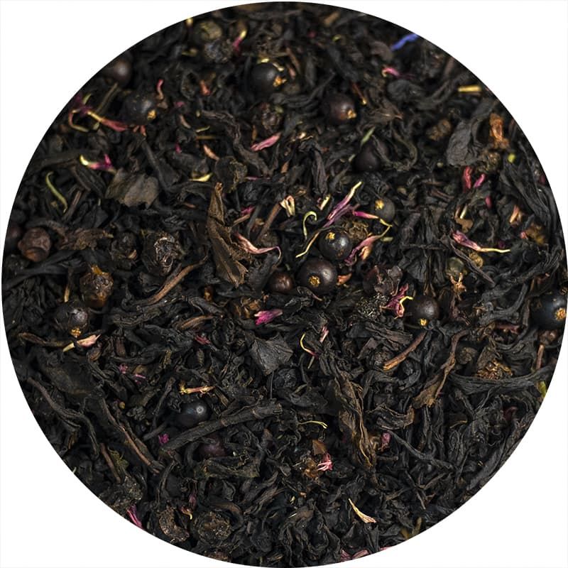 Чай черный ассам, можжевеловая ягода, цветки василька, листья вербены, кусочки клубники.