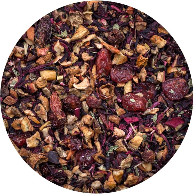 Гибискус, бузина, клюква, листья малины, ароматизированый натуральными маслами.