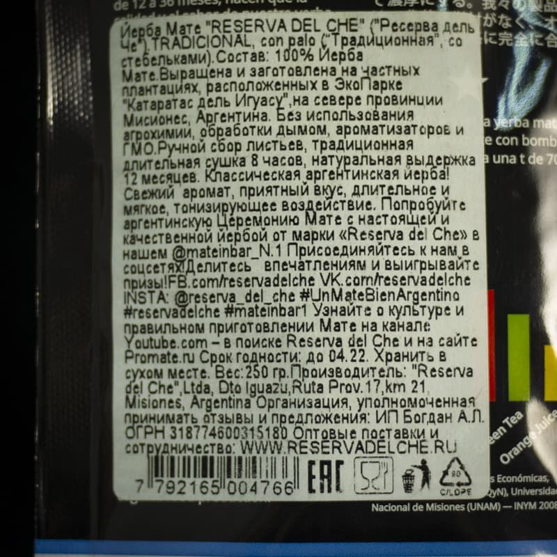 Сорт мате Reserva del Che Tradicional Con Palo представляет собой классический аргентинский помол йербы со стеблями и веточками (con palo), имеющий умеренное количество пыли (polvo).