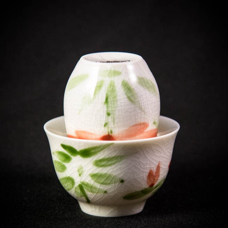 Последовательность действий при чаепитии с парами такова: сперва чай наливается в высокую пиалу и накрывается сверху низкой. Затем обе чаши переворачиваются – чайный настой из высокой перетекает в низкую. Наконец, из высокой пиалы «вэн сян бэй» вдыхается аромат и лишь затем чай пьется из чаши «пин мин бэй». Смысл этого действа – выделить запах чая, уделить ему большее внимание. Традиционно, этот метод чаепития применяется при заваривании улунов. Чайная пара имеет подглазурную роспись и сделана в технике «колотый лед». Лотос, изображенный на чайной паре является символом чистоты мыслей и духовного совершенствования.