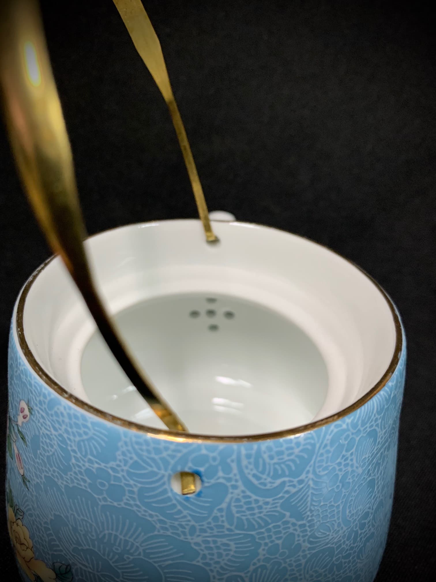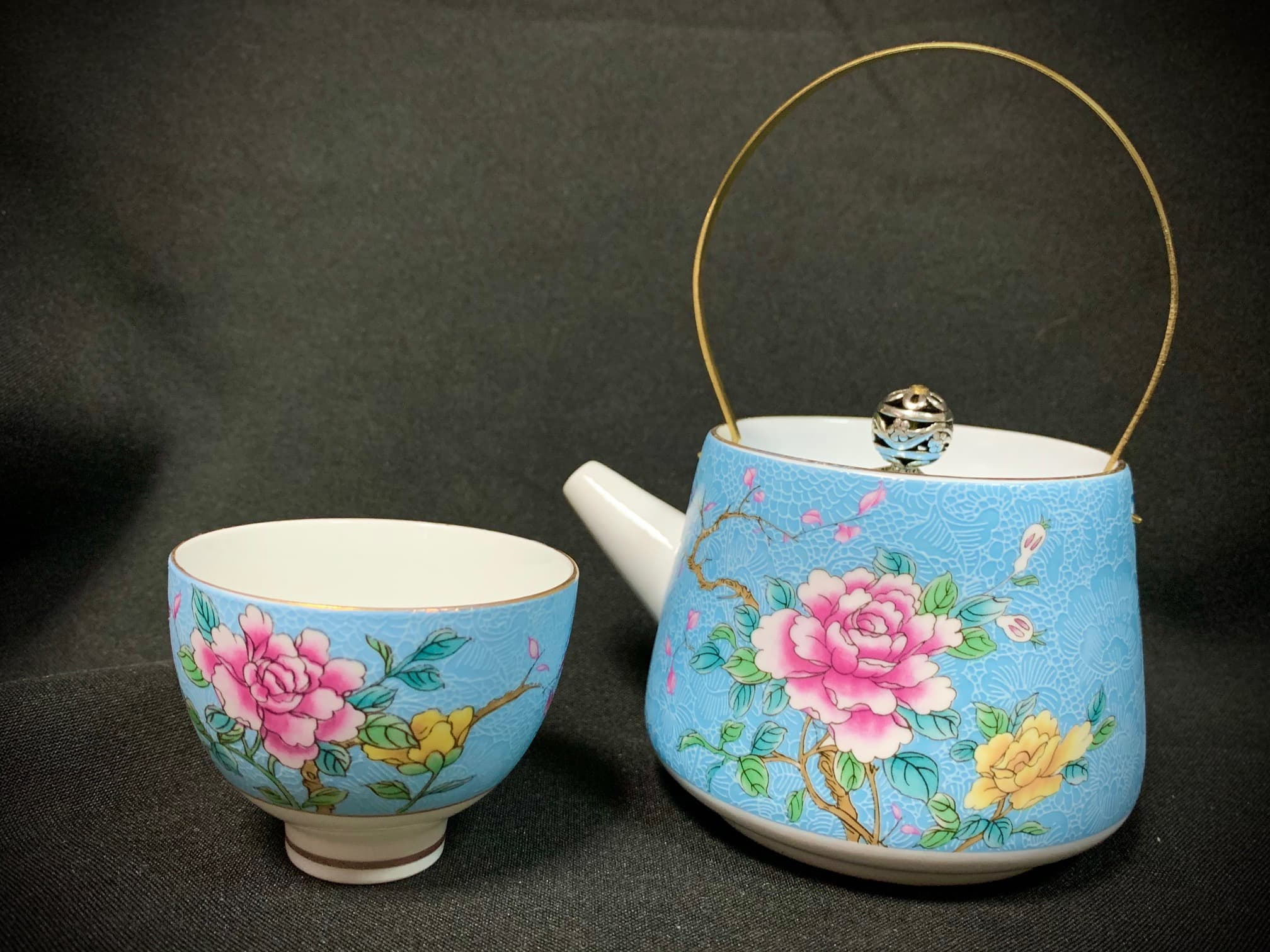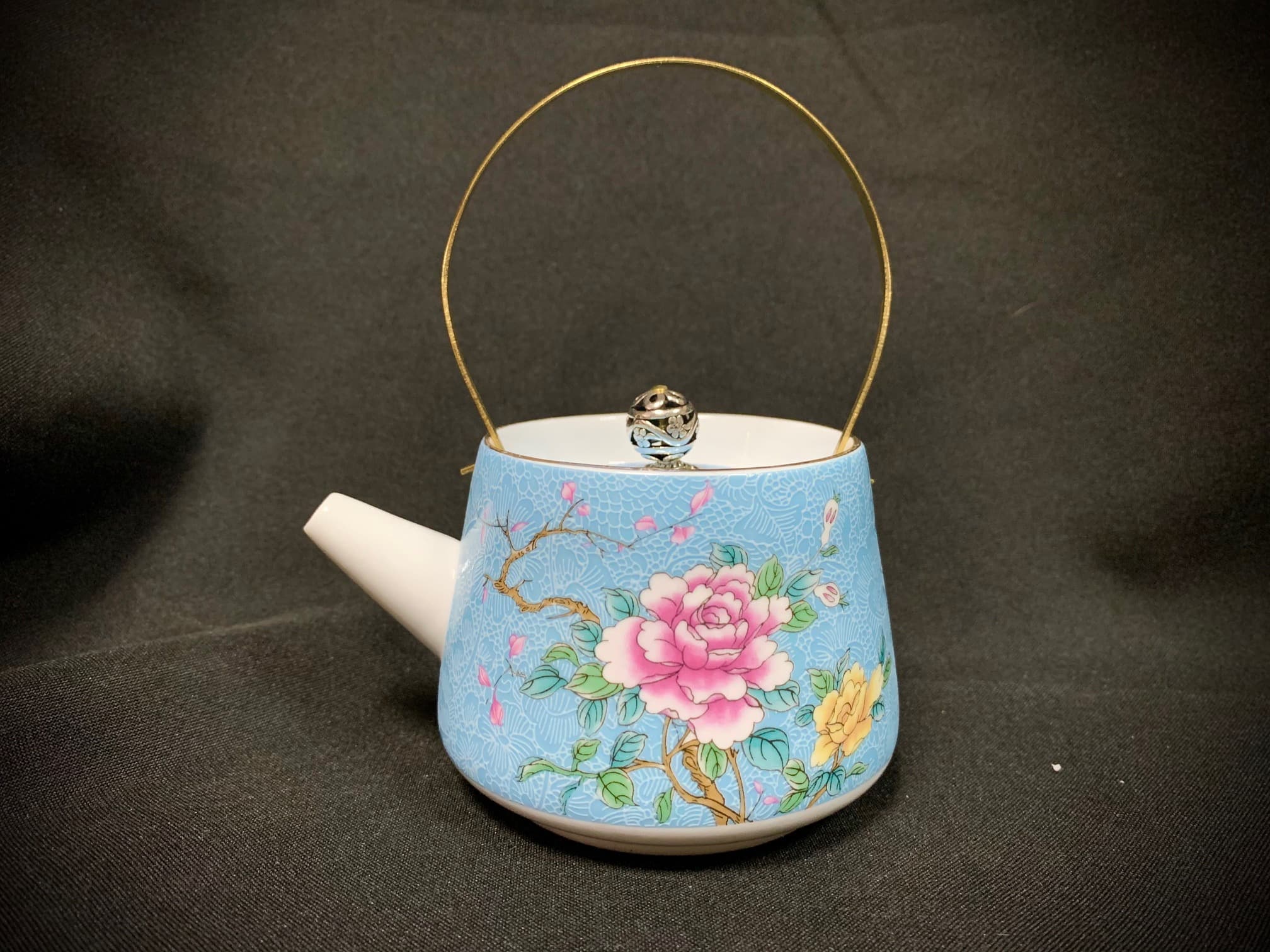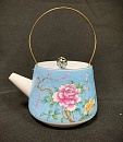 Фарфоровый чайник для чайной церемонии светло- голубого цвета. Носик и внутренняя поверхность — молочного оттенка. Имеет съемную золотистую ручку и внутреннее ситечко в виде мелких отверстий в области носика. Украшен рельефным орнаментом и цветочным узором. В нашем магазине вы также можете приобрести пиалы, выполненные в таком же дизайне.