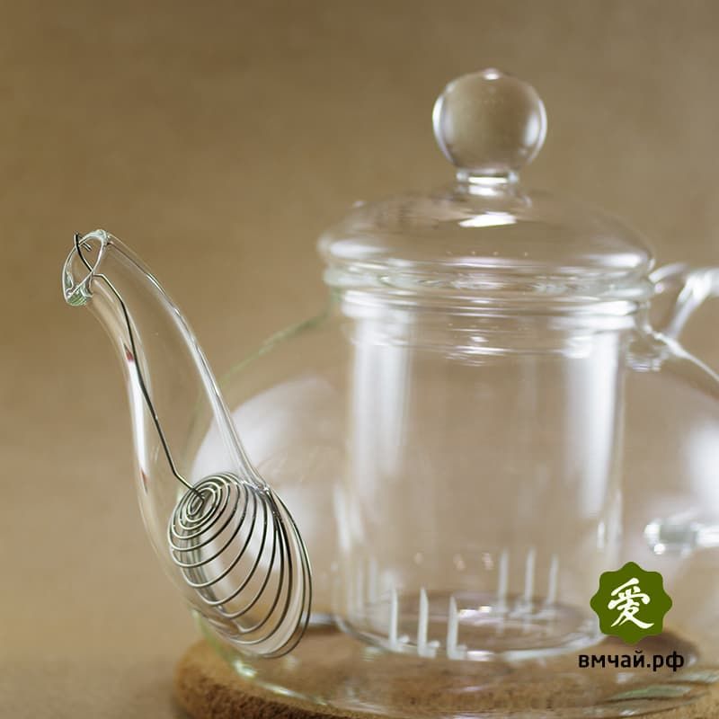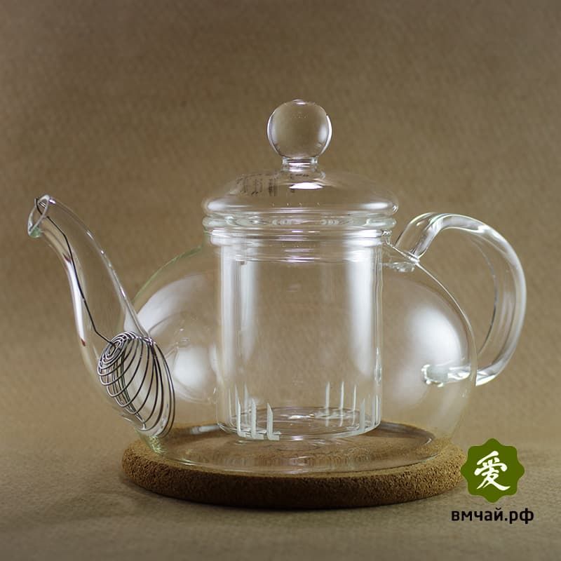 Заварочный чайник из жаропрочного стекла с пробковой подставкой и пружинкой-фильтром в носике. Пробковая подставка уютно выглядит и защищает стол от капель. Фильтр и колба предотвращают попадание чаинок в носик чайника - теперь чайник легко мыть! Объем 800 мл.